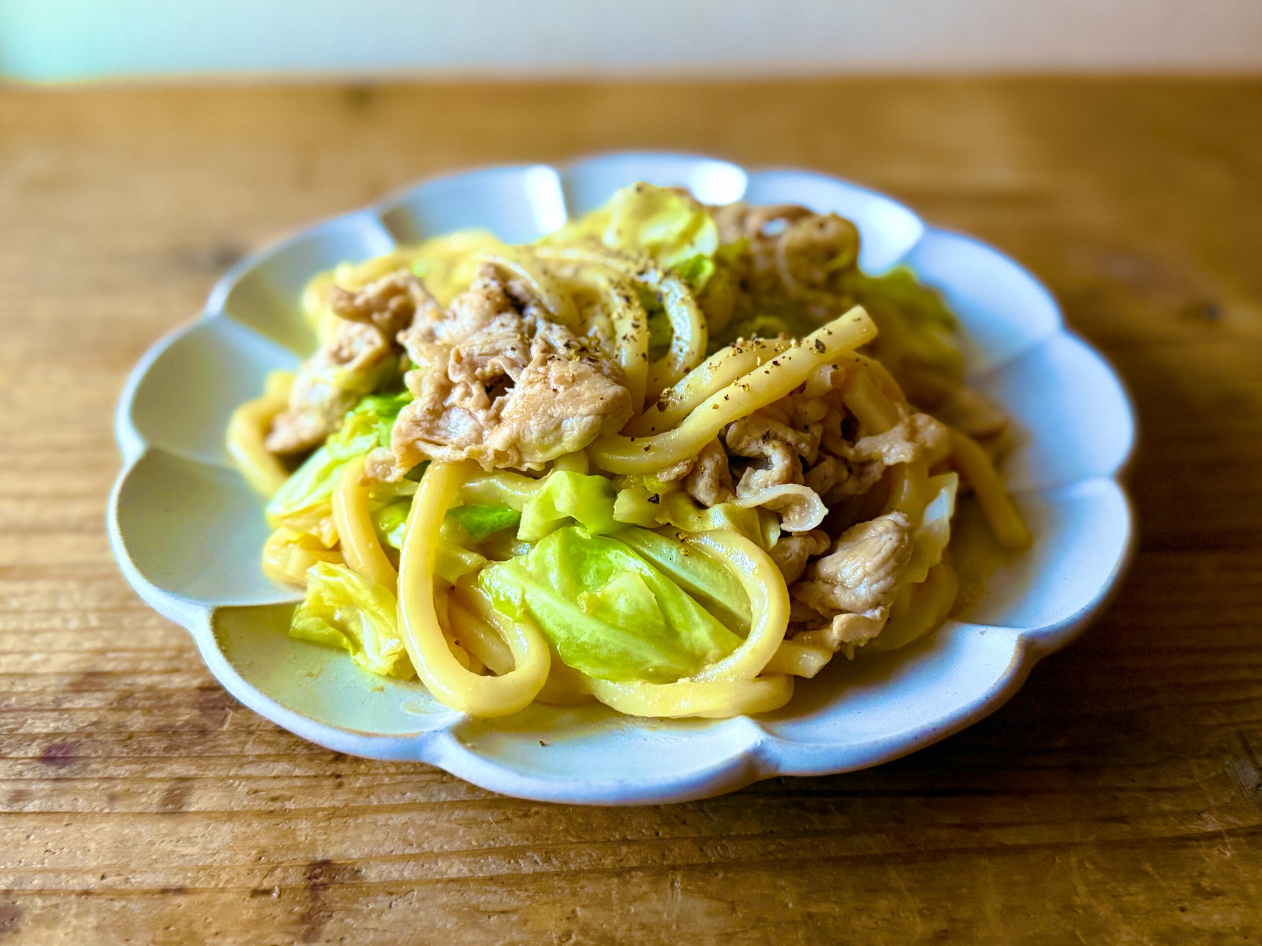 ちなみに、このレシピの初代試作は豚肉+キャベツ+玉ねぎで、少し甘めの味噌バター焼きうどんやったんですが、 夫に食べてもらったら「バターいらんな〜」ってバッサリ(笑)。 そこで夫好みのガーリック風味&ごま油のガッツリ系にしてみたら…大成功! 今では私も夫も「これや!」って定番になりました。