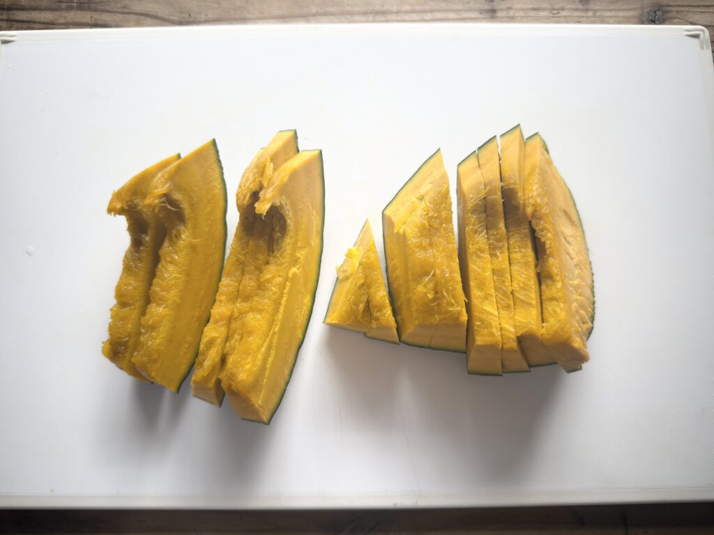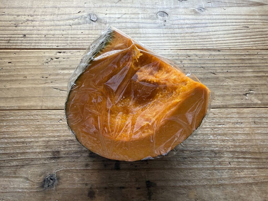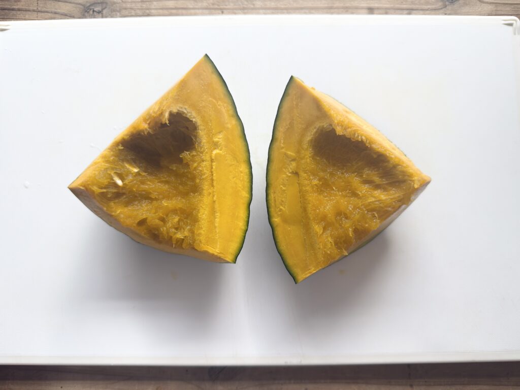 「硬いカボチャ切るの怖い…」という方は、種とワタを除いて洗ったかぼちゃを濡れたままラップでふんわり包み、レンジで4分半加熱してから切ってみてください。