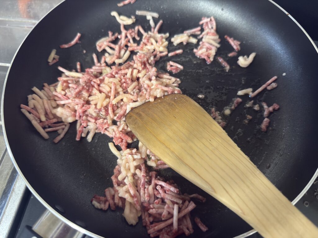 ※テフロン加工(フライパンの表面ツルツルでくっつかない加工)でない場合は油を小さじ1ほどひいてくださいな。