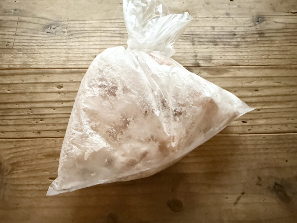 まずは粉と塩こしょうだけ振り混ぜてから鶏肉をIN!もちろんお皿の上などでまぶしてもOKです!