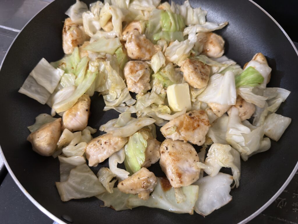バターの風味を楽しめるように、バターは最後にIN!(バターの摂りすぎはLDL(悪玉)コレステロールを上げやすいので、最初は油を使って仕上げに少量のバターを風味付けに投入します