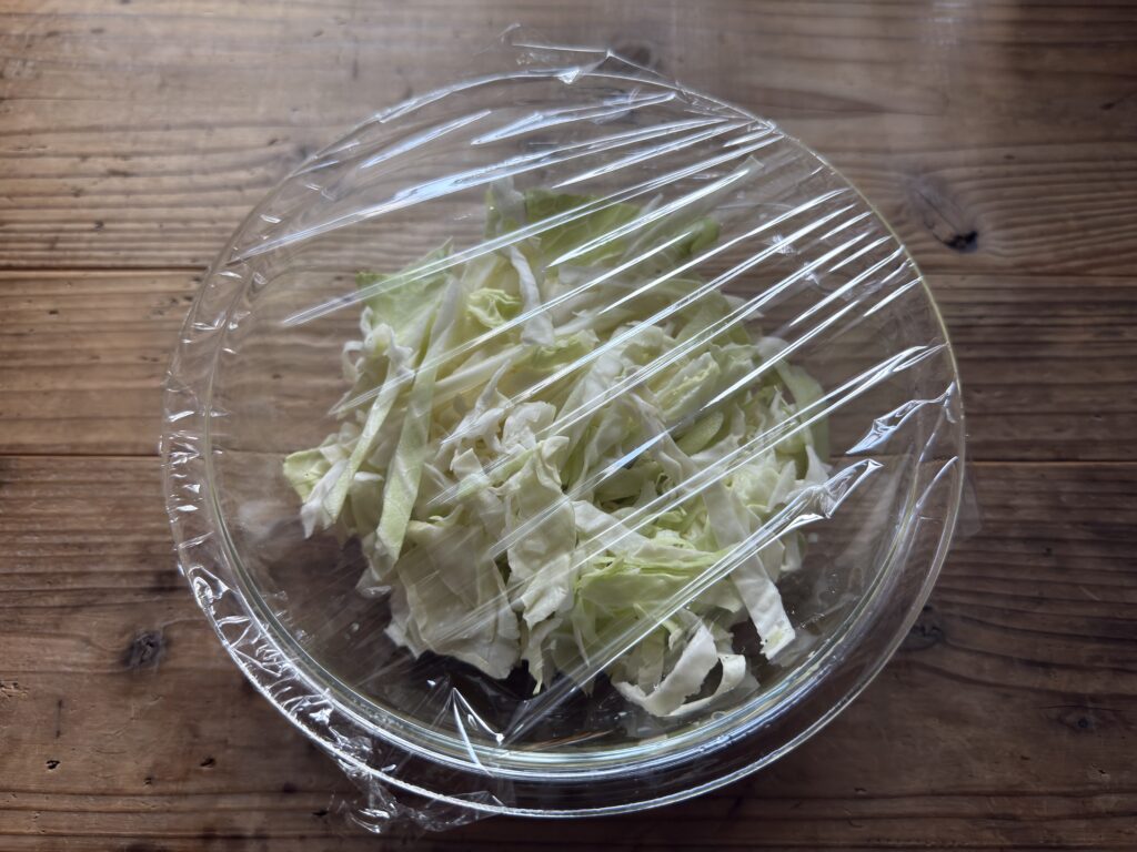 キャベツは5mm幅に切って耐熱容器に入れ、 少し隙間が開くようにラップして600Wのレンジで2分30秒加熱する。