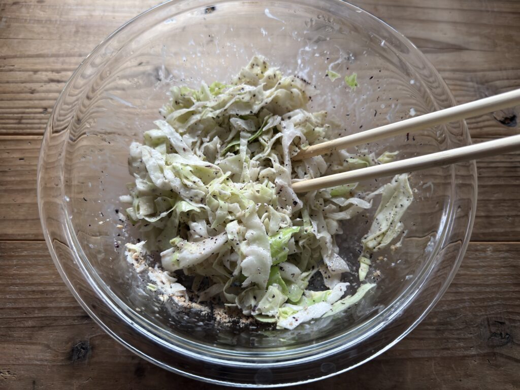 ・すりごまはなしでもOKですが、入れることでごまの風味がプラスされるのと、キャベツから出る水分を吸収してくれる2つの役割がありますぞ。