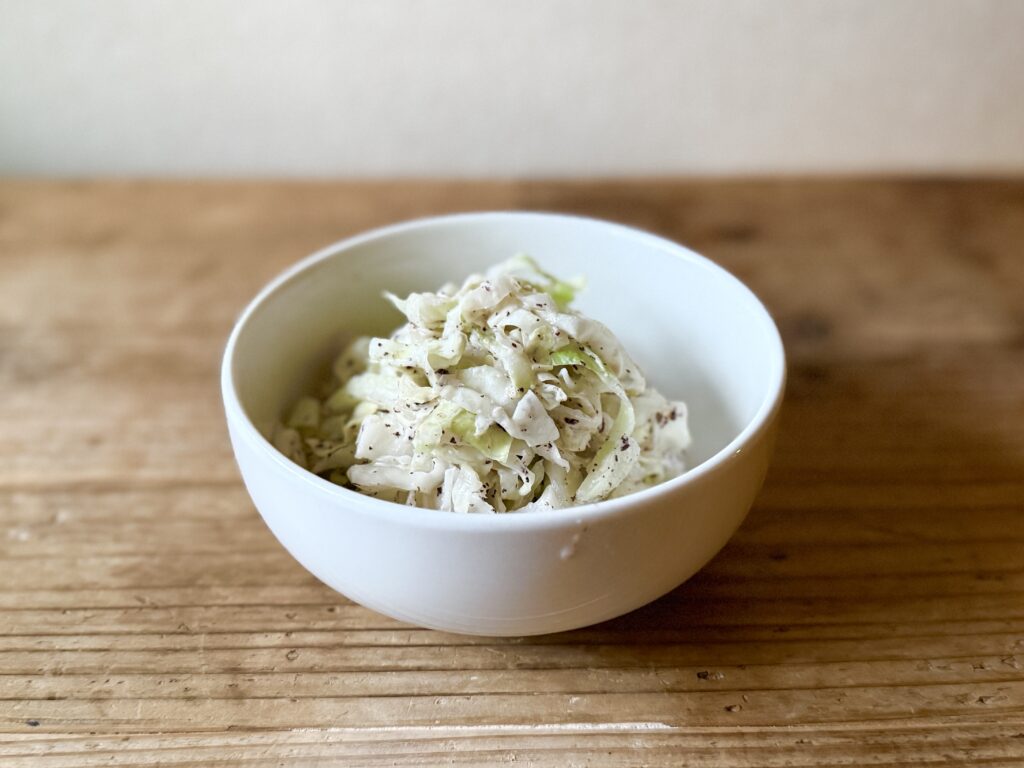 キャベツを切ってチンして和えるだけ!初めての味付けやのに昔から食べたことがあるような馴染みのあるうまさです。サラダのマンネリ解消にもおすすめですぞ