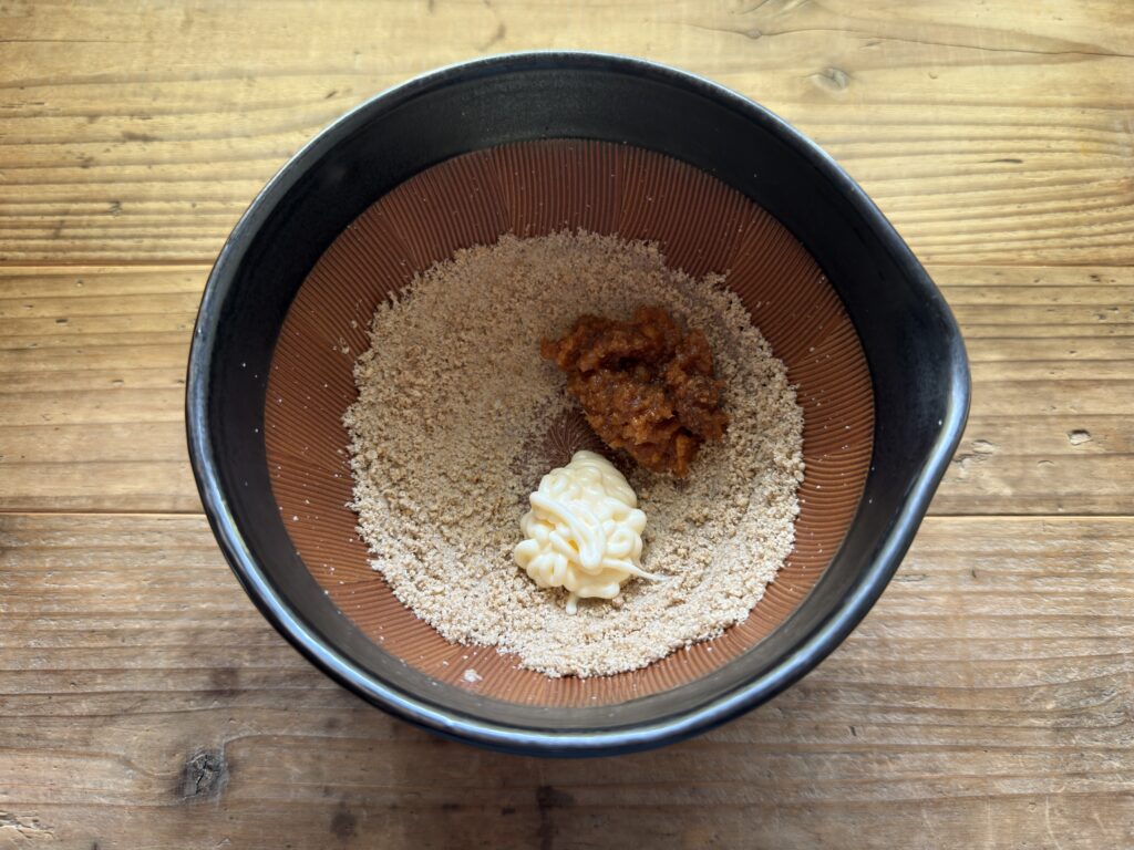 先に調味料を混ぜておかないと、味噌の塊とかができてしまうことも…