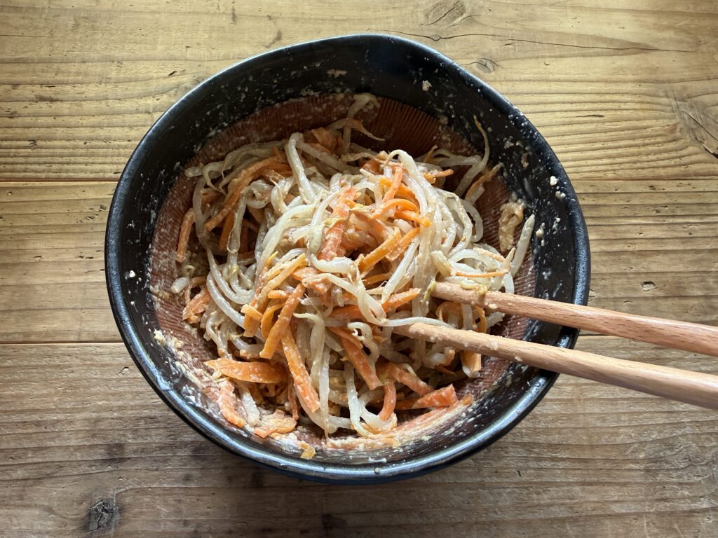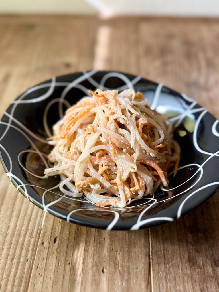 レンジでチンして和えるだけ!もやしのシャキシャキ食感と、人参の甘み、味噌&胡麻&マヨのコクで、お箸が止まらない味わい!人参を嫌がる子どもたちも喜んで食べてくれる1品です