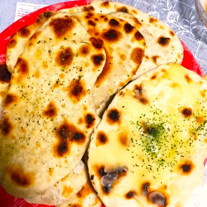 ナン生地の上にチーズをのせて焼いたり、ウインナーを挟んで食べたりとアレンジも自在。