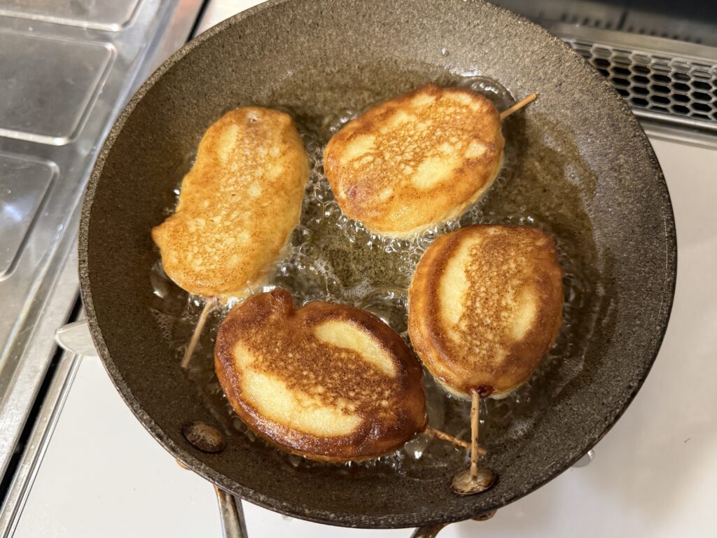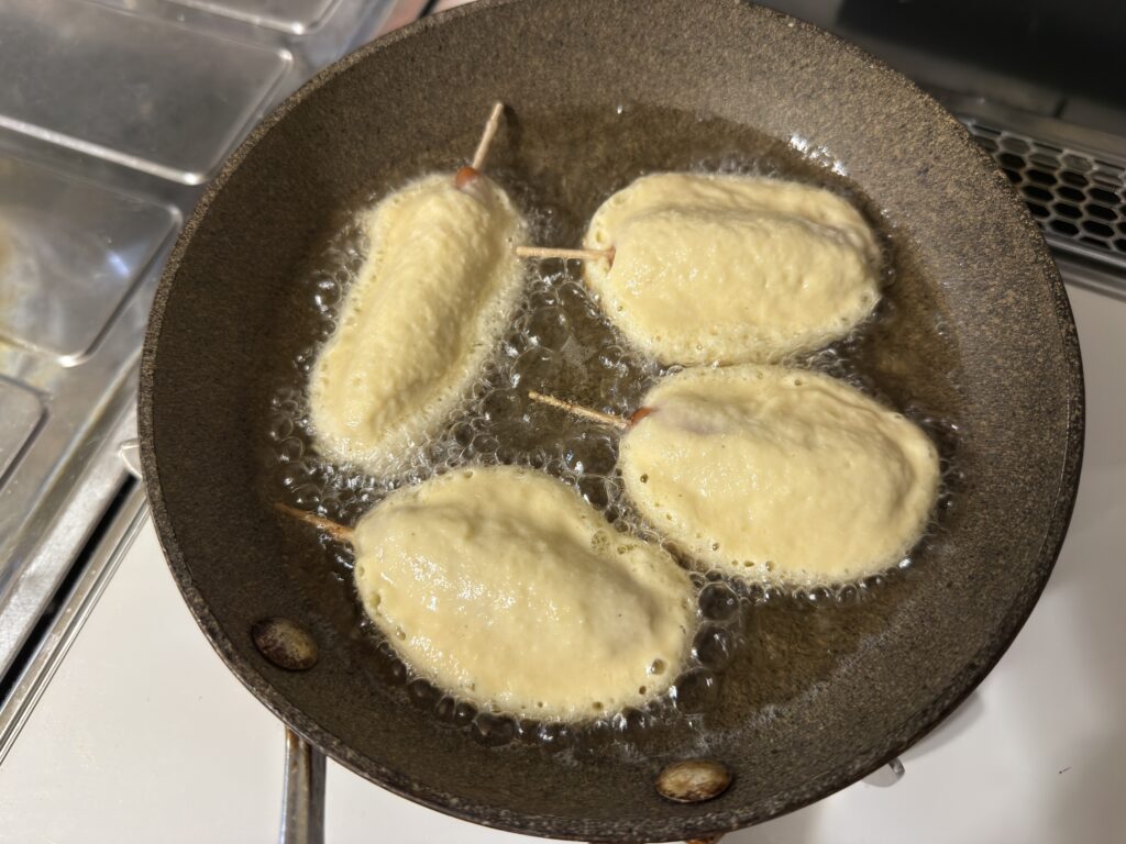フライパンの底1㎝くらいまで油を入れ、170℃に温める。ウインナーを生地にくぐらせて、入れて両面きつね色になるまで約2分ずつ揚げ焼きにする。