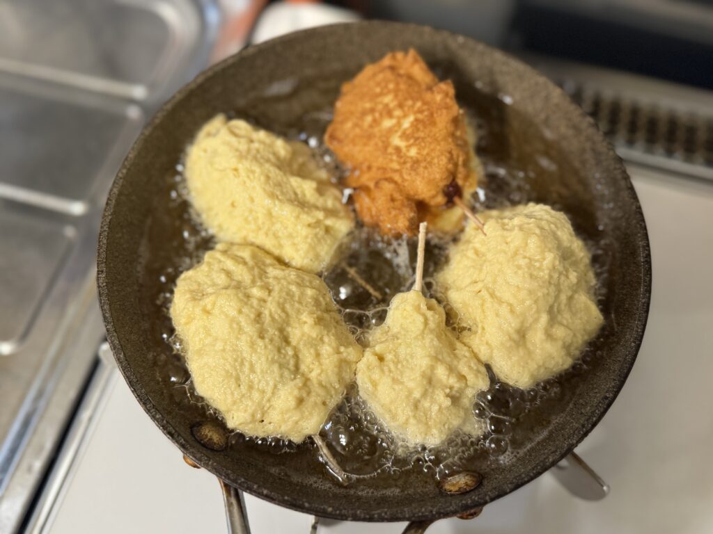 生地が落ちないように、まとわせたらすぐに油へドボン!