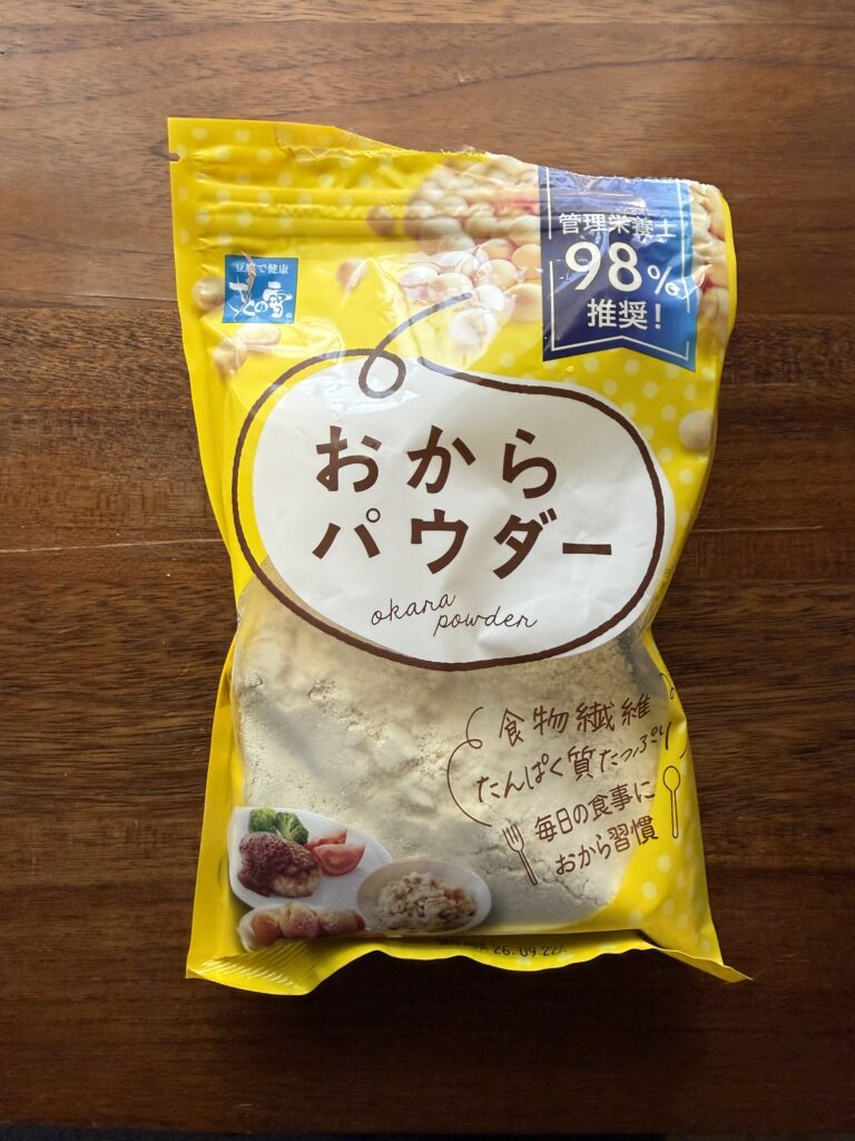 ▼ちなみに、生おからの種類によって水分量が異なるので、今回はこちらのおからパウダーを使用しました。(開封済みですみません。しかも手で適当な感じ…)