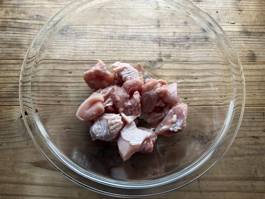 ①鶏もも肉1/2枚(160g)は一口大に切って耐熱ボウルに入れる。