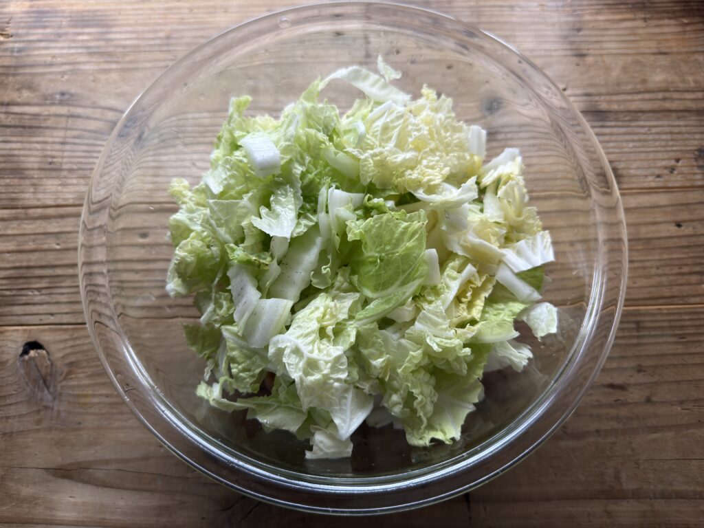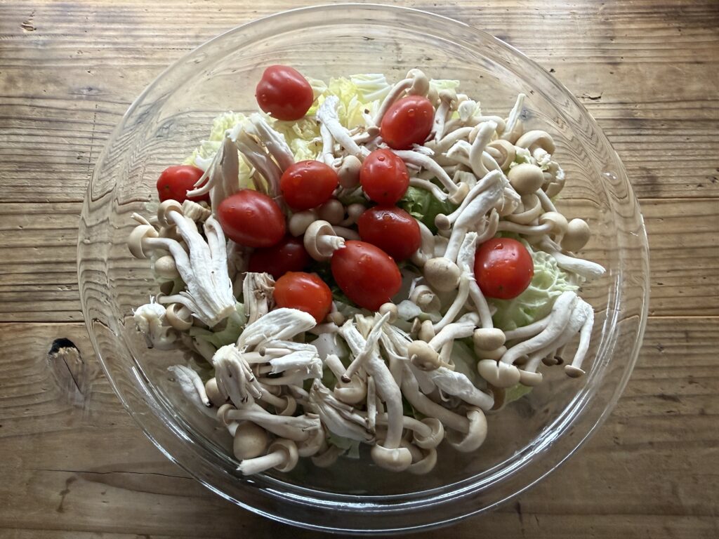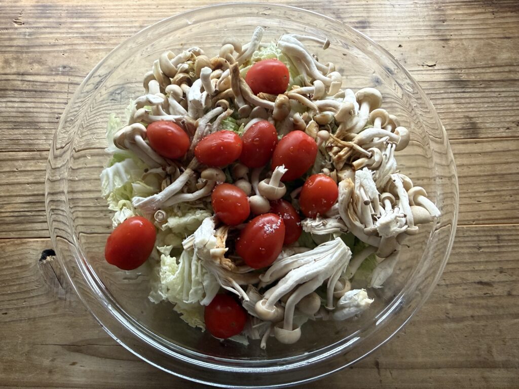 ②その上に、1.5㎝幅に切った白菜2枚(160g)、しめじ1/2パック(60g)、ミニトマト5個(50g)を順番にのせる。